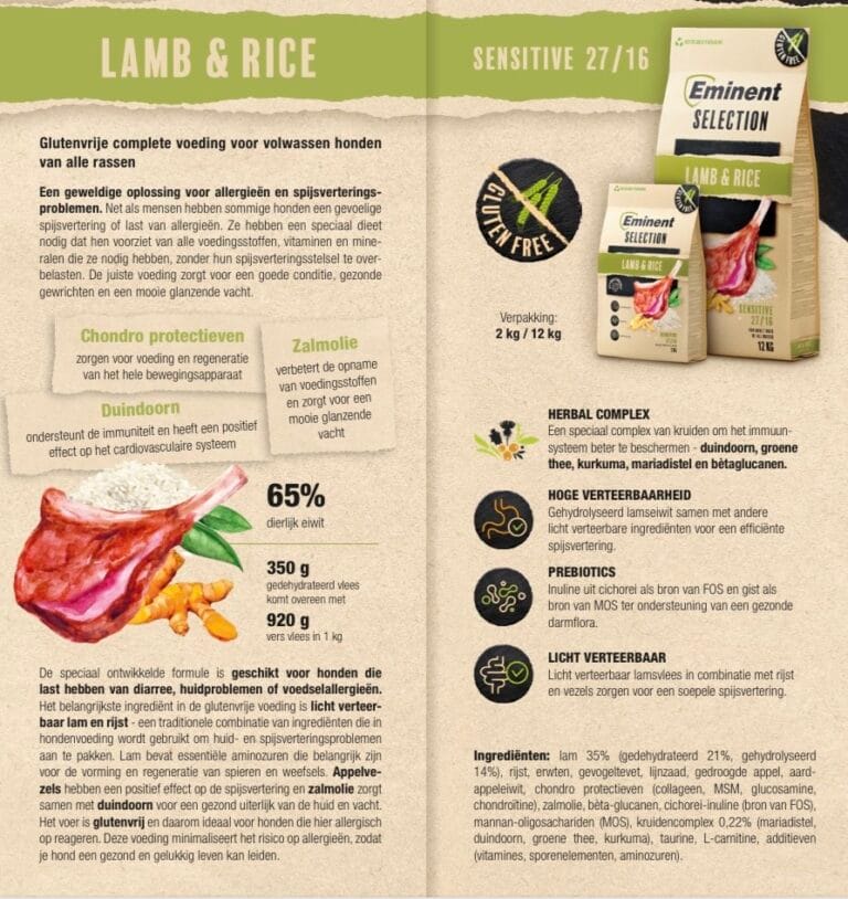 De speciaal ontwikkelde formule is geschikt voor honden die last hebben van diarree, huidproblemen of voedselallergieën. Het belangrijkste ingrediënt in de glutenvrije voeding is licht verteerbaar lam en rijst – een combinatie van hypoallergene dierlijke en plantaardige eiwitten. Deze makkelijk verteerbare en uitgebalanceerde hondenvoeding wordt gebruikt om huid- en spijsverteringsproblemen aan te pakken. Lamsvlees en rijst zijn een bron van energie. Ze zijn zeer geschikt voor de voeding en regeneratie van spieren en weefsels. Appelvezels helpen de spijsvertering te verbeteren en zalmolie zorgt samen met duindoorn voor een gezond uiterlijk van huid en vacht. De toevoeging van kruiden ondersteunt het immuunsysteem en heeft een positief effect op de darmen. Deze voeding minimaliseert het risico op allergieën, zodat je hond een gezond en gelukkig leven kan leiden.